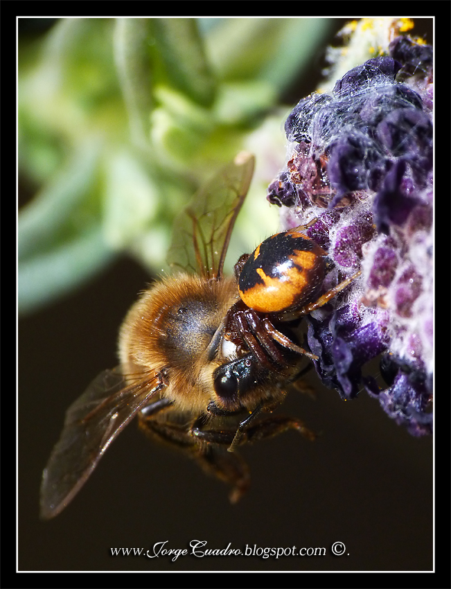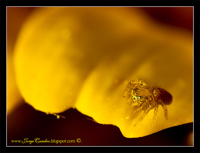 Pues a lo que iba, me quedo observando algunas abejas entre las flores y me doy cuenta que hay varias que están muertas como disecadas sobre las flores, y me resulta muy extraño que haya tantas de esta forma, lo cual pica mi curiosidad, será alguna enfermedad o ve tu a saber... hasta que descubro a otro ser diminuto, del tamaño de poco mas de una lenteja que va saltando de flor en flor colgado de unas micro lianas cazando abejas.