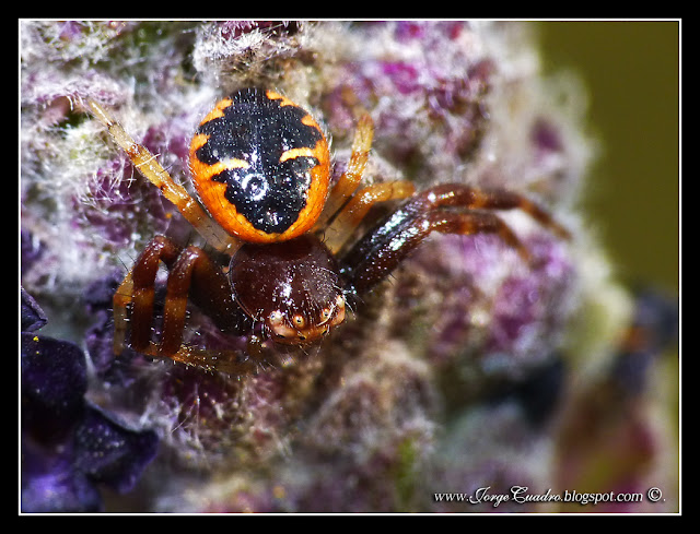 Se trata de una pequeñísima araña que a diferencia de las que tejen las telas y esperan a que se atrapen otros insectos esta va saltando con las brazas abiertas sobre las abejas al vuelo que se acercan a coger el polen de las flores o se quedan inmóviles con las brazas abiertas en forma de percha esperando que se le acerque alguna abeja y cerrarse como un cepo.
